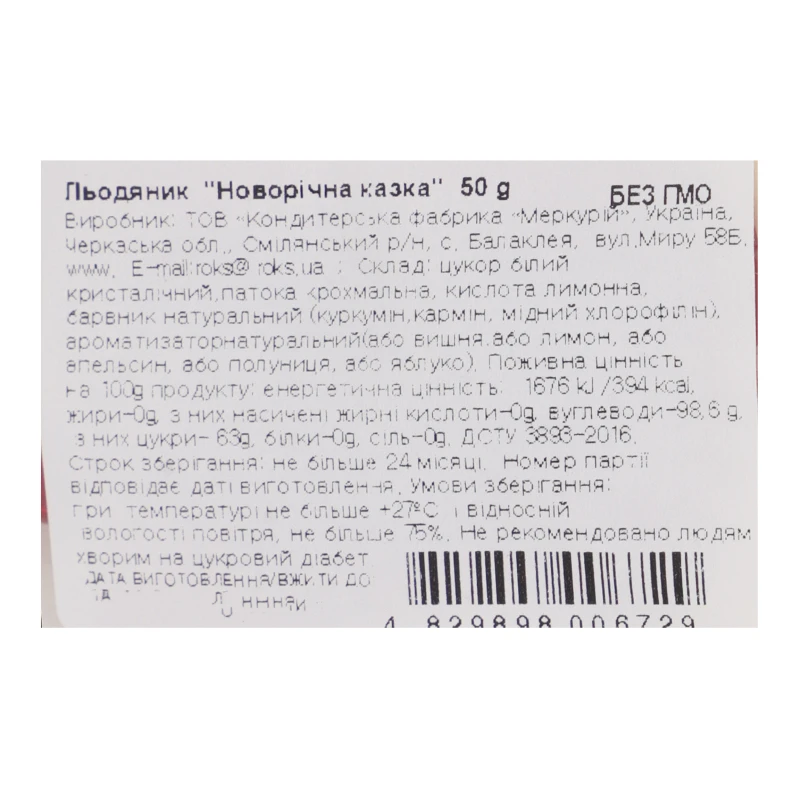 Цукор білий кристалічний, патока крохмальна, кислота лимонна, барвник натуральний (куркумін, кармін, мідний хлорофілін), ароматизатор натуральний (або вишня, або лимон, або апельсин, або полуниця, або яблуко)Харчова та енергетична цінність на 100г продукту