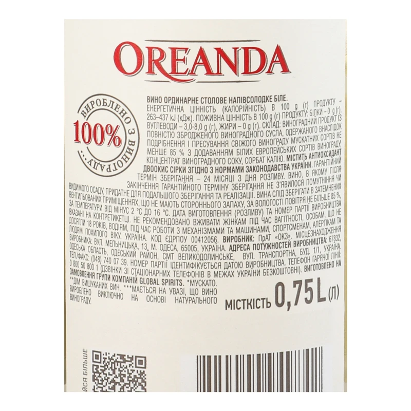 Вино Oreanda Muscato біле напівсолодке 9-13% 0.75л